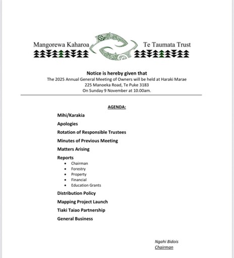 Mangorewa Kaharoa Te Taumata Trust continues to be a sustainable Trust maintaining the high values and protocols passed down by previous Trustees and Owners. The Trustees endeavour to ensure Mangorewa Kaharoa Te Taumata Trust flourishes for many years to come by looking for more future opportunities while maintaining the current portfolios, values and protocols that Mangorewa Kaharoa Te Taumata trust has always enjoyed.